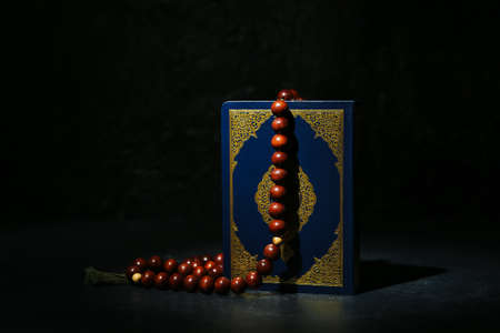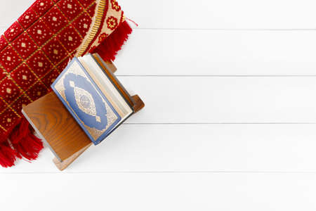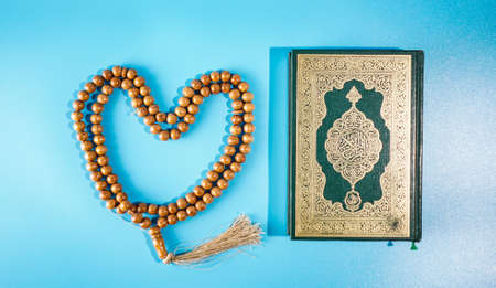 Top view Holy Al Quran with written arabic calligraphy.Islamic concept background.