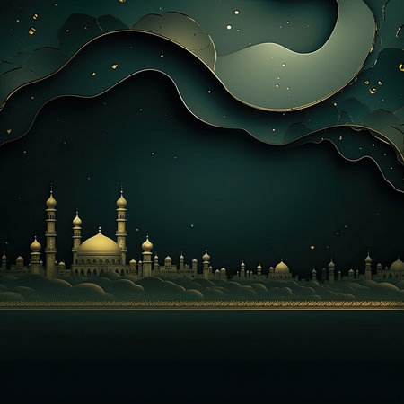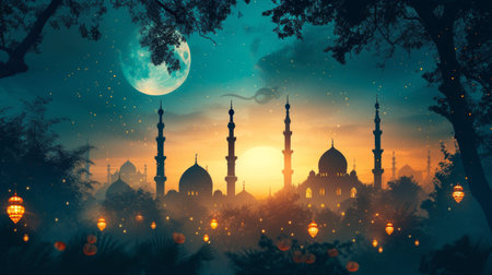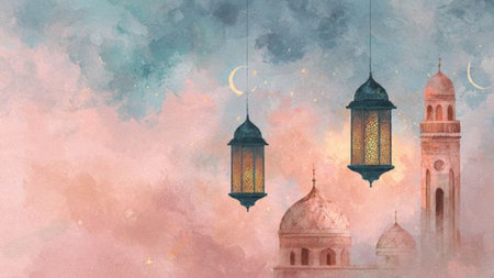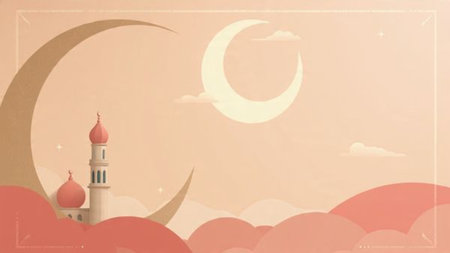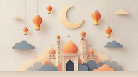Modern illustration of a mosque at night with a crescent moon, lanterns, and soft clouds.
