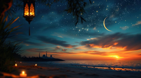 Nighttime Ramadan scene, crescent moon, and calmness in the air with copy space.
