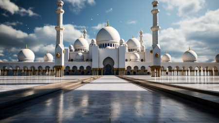 This image captures the stunning architecture of a mosque, showcasing its large, white domes adorned with golden finials and crescent moons. The mosque's intricate design and serene atmosphere are highlighted against a clear blue sky, emphasizing its grandeur and spiritual significance.