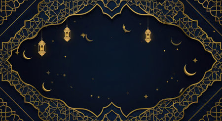 Ramadan Kareem greeting card with golden lanterns and crescent moon on dark blue background