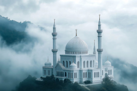 Stunning white mosque with multiple minarets and domes is standing tall on a mountain top, enveloped in ethereal misty clouds