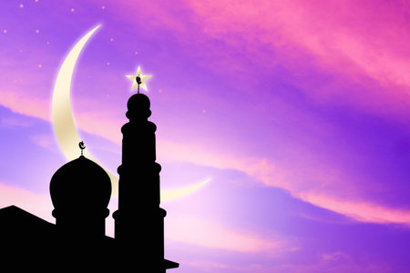 Silhouette of several mosques are shown under a crescent moon in a beautiful colorful cloudy sky with stars background at night time.