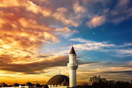 Mosque on background of a multicolored sunset. Silhouette of a mosque in evening sky. Dome of a Muslim mosque with minarets. Prayer house for Muslims. Concept - Arab prayer house. Belief in Islam
