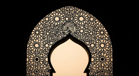 Archway showing intricate islamic geometric pattern archway with arabic calligraphy illuminated from behind on a black background. resolution...