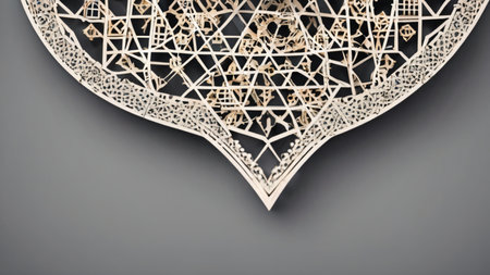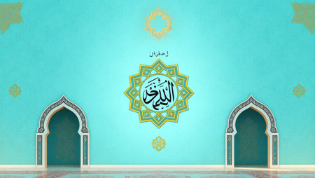 A minimalist Islamic archway forms a niche with a subtle geometric star ornament inside, illuminated by soft, diffused lighting against a neutral...