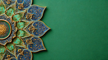 Green Islamic background, luxurious arabesque mandala ornaments, Ramadan Kareem, Eid al-Fitr, Eid al-Adha, circular Arabic designs in the corners, with copy space.