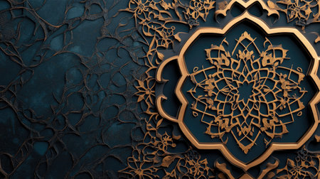 Exquisite gold Islamic patterns adorn a dark textured backdrop, exuding elegance. Islamic Arabic Arabesque Ornament Border Luxury Abstract black Background with Copy Space