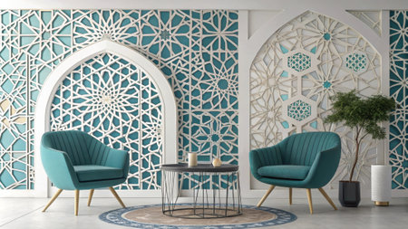 Intricate geometric shapes form a visually stunning backdrop contrasting smoothly with sleek furniture adding a layer of sophistication and visual intrigue..