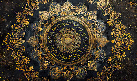 This image showcases intricate Arabic calligraphy with golden accents on a richly textured background, highlighting cultural beauty and artistic craftsmanship.