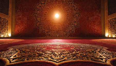 Golden Islamic geometric patterns are set on a black marble floor, with dramatic lighting casting shadows, creating a luxurious and ornate visual.