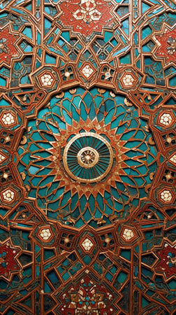 This stunning architectural ceiling artwork showcases intricate geometric patterns in vibrant colors, blending cultural heritage with artistic creativity for a unique visual experience.