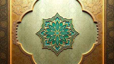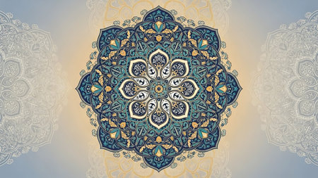 Geometric showing elaborate circular mandala with intricate floral and geometric patterns in deep teal gold and cream hues with a subtle faded mandala overlay....