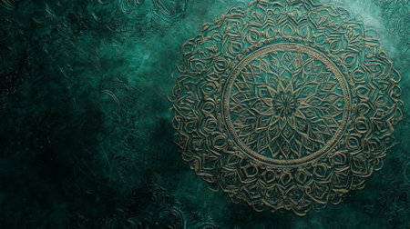 An emerald textured background featuring a fine, intricate mandala pattern. The detailed design and rich green hues add a touch of spirituality and calm.