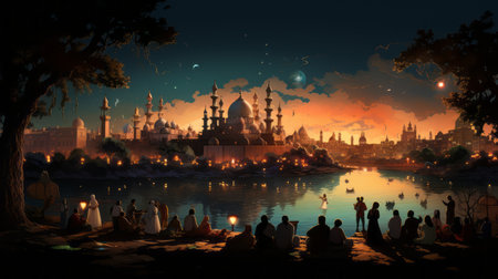 A Ramadan lantern with a mosque in the background during the evening time. The lantern is glowing and the mosque is silhouetted against the sky. Religious and traditional.