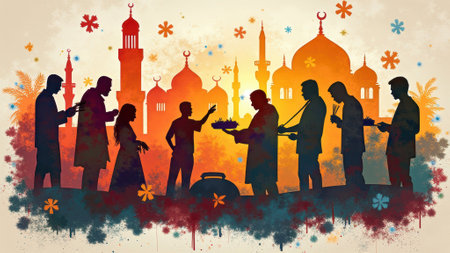 Ramadan Kareem background with mosque, crescent moon and sheep