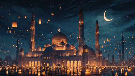 Ramadan Kareem Mosque at night with moon in the sky.