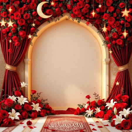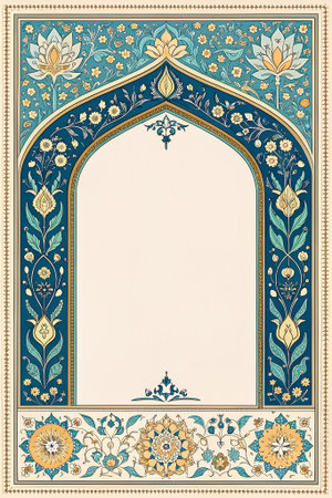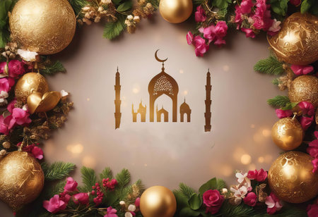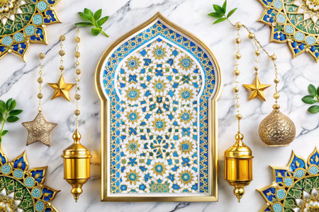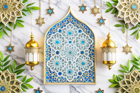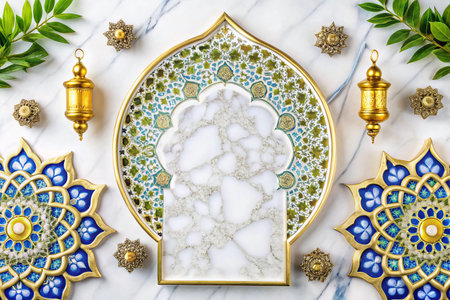 Islamic art, decorative arch, gold lanterns, marble background, festive design
