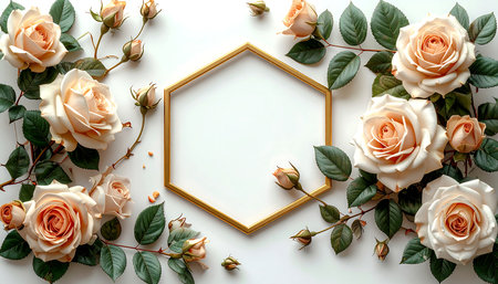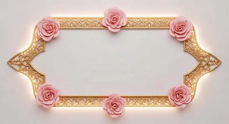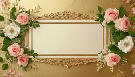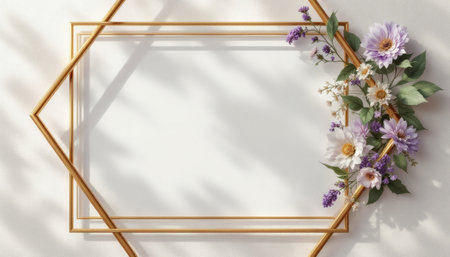 Golden geometric frame adorned with delicate flowers offers copy space to suit your announcements or invitations Best for creative presentations.