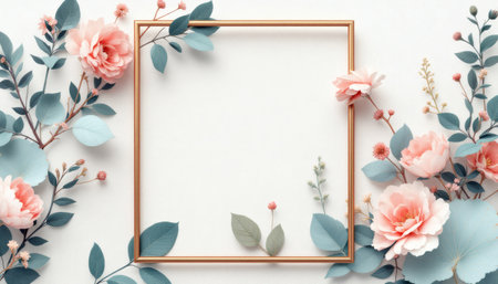 Elegant frame surrounded by pink roses and blue leaves creates a delicate floral design with a white background, perfect for invitations or branding.