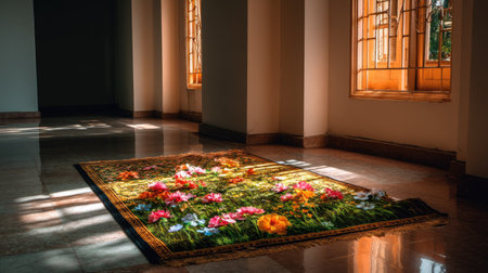 A beautifully designed carpet featuring vibrant floral patterns lies on a polished floor in a bright indoor space, creating a warm and inviting atmosphere.