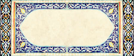 Grunge horizontal banner with old paper texture and detail of traditional persian mosaic geometric and floral ornament, Iran. Mock up template. Copy space for text