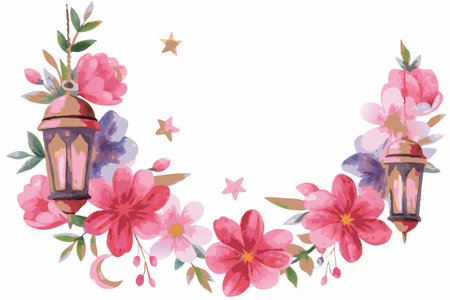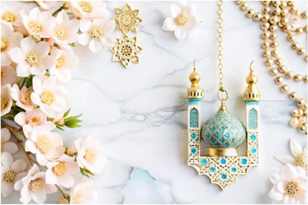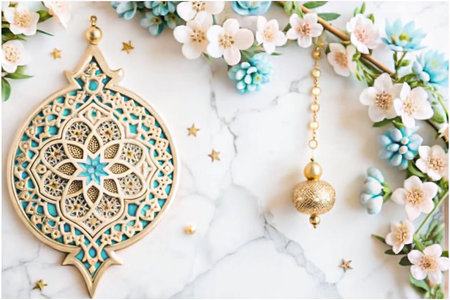 Decorative Islamic lanterns, floral embellishments, marble background, celebration