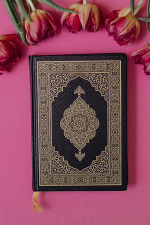 Holy Quran on a pink background with flowers. Tulips. Ramadan. Hatm of the Qur'an. Reading the Quran. Ramadan concept. Islamic concept.