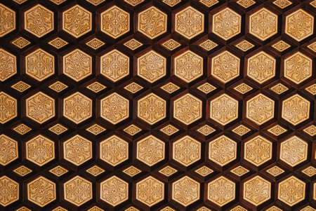 The ceiling is carved with ancient Asian ornament. the details of the architecture of medieval Central Asia