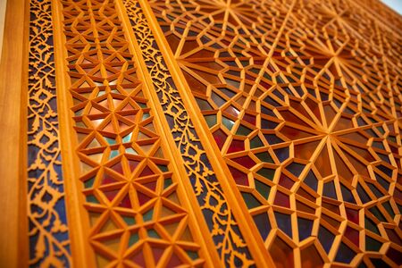 Ornate geometric arabesque design with intricate golden patterns on architectural frame