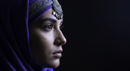 Thoughtful young woman in a purple hijab and ornate silver headpiece, depicted in a dramatic close up studio portrait.
