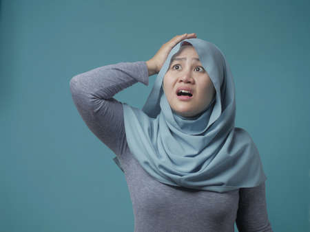 Portrait of Asian muslim woman wearing hijab looks confused and worried gesture, against blue background