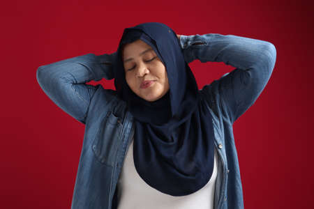 Beautiful Muslim Business woman executive wear Hijab sitting on a desk with a stress face reaction