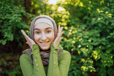 Beautiful joyful teen high school girl wearing colorful muslim clothing having fun outdoors