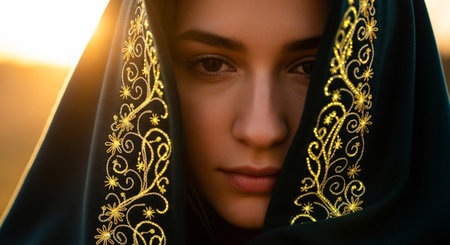 Portrait d’une femme voilée avec broderie dorée au coucher du soleil.