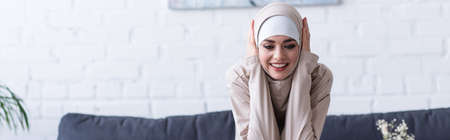 Portrait of young smiling Muslim woman wearing hijab head scarf. Blurred backdrop
