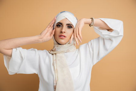 graceful muslim woman in elegant attire holding hands near face and looking at camera on beige