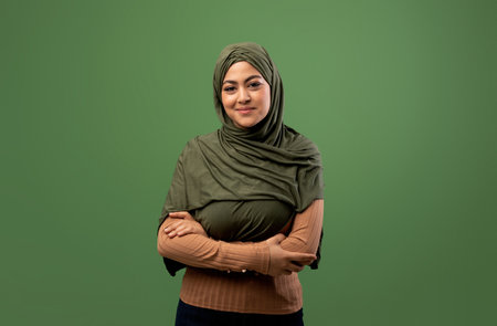 Muslim beauty concept. Portrait of young arab woman in hijab posing with folded arms over dark green background