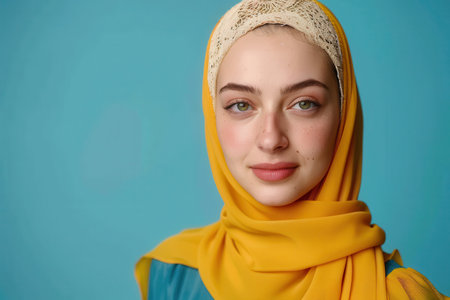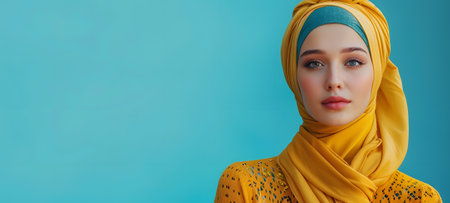 Portrait of a beautiful young muslim woman in hijab on blue background.