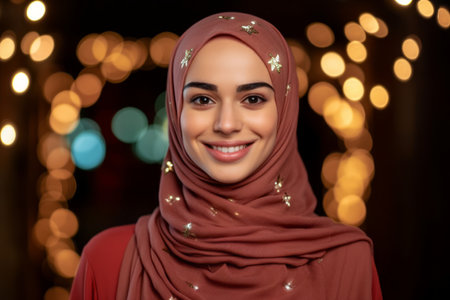 Portrait of beautiful muslim woman wearing hijab on blurred lights background