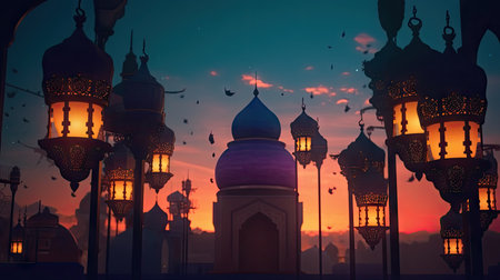 A Ramadan lantern with a mosque in the background during the evening time. The lantern is glowing and the mosque is silhouetted against the sky. Religious and traditional.