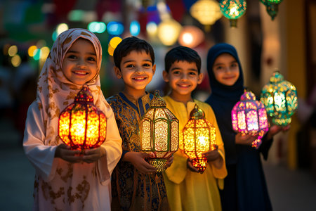 Smiling Arab children holding Arabic lanterns, celebrating a festival at night during Ramadan.