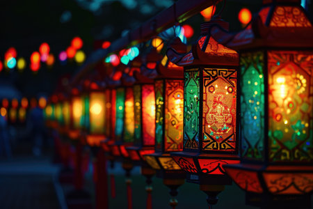 A line of illuminated lanterns hangs against a blurred background, creating a warm, inviting atmosphere. The scene features a variety of lantern designs and soft, golden light. This image is suitable for a range of commercial applications, including editorial content and design projects.
