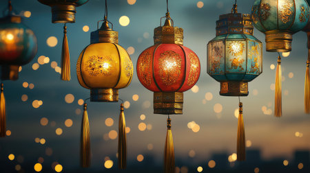 Hanging lanterns in vibrant colors with golden tassels gently swaying against a dusky sky with space below
