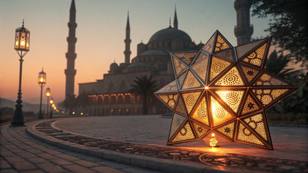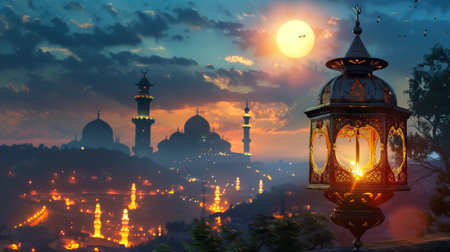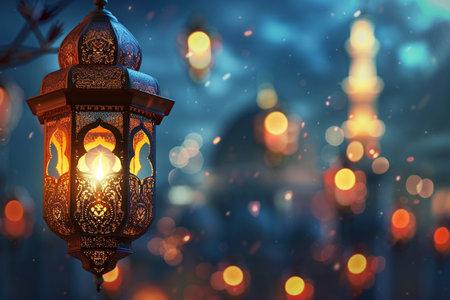 Elegant lantern and festive lights creating warm ambiance against mosque silhouette.