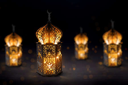 Candle light lids on muslim style's lantern shining on dark background, use as greeting on ramadan kareem mubarak