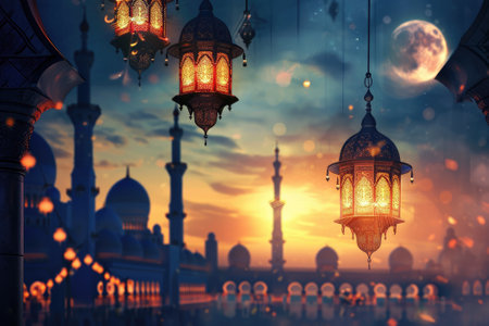Medina mosque at dusk with radiant lanterns. Symbolizes faith, culture, tradition, and Middle Eastern architecture.