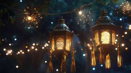 Two elegant lanterns emit a warm glow, surrounded by sparkling lights in a serene night scene. The intricate details enhance the festive atmosphere, perfect for celebrations.