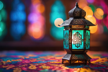 An ornamental Arabic lantern with colorful glass glowing on a dark background, a greeting for Ramadan and Eid.