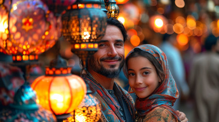 Ai Generative photo of a happy muslim family with ramadan lanterns in streets